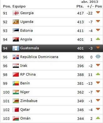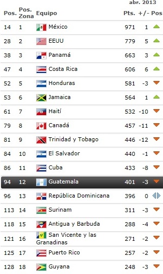 Guatemala, 11 de abril de 2013. La Selección Nacional de Guatemala, alcanzo 401 puntos en el ranking que publicó hoy la Federación Internacional de Fútbol Asociado, descendiendo tres posiciones con relación al ranking del mes de marzo, el combinado nacional se ubica en puesto 94 del escalafón mundial de la FIFA.