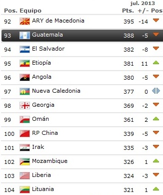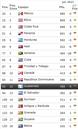 Guatemala, 04 de julio de 2013. La Selección Nacional de Guatemala, alcanzo 388 puntos en el ranking que publicó hoy la Federación Internacional de Fútbol Asociado, descendiendo cinco posiciones con relación al ranking del mes de junio, el combinado nacional se ubica en puesto 93 del escalafón mundial de la FIFA.