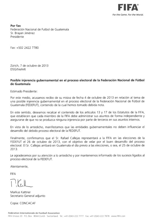 Que derivado de diversas situaciones que se han suscitado en los últimos meses, por el hecho de que el 26 de octubre del presente año se realizarán elecciones generales para optar a cargos en el Comité Ejecutivo de esta Federación, nos vemos en la necesidad de informar públicamente que se han estado realizando acciones que denotan el aprovechamiento ilegítimo de parte de personas que pretenden llegar a la Federación, aunque sea violentando las propias normativas básicas de FIFA, como que cada Asociación ó Federación debe administrar sus asuntos en forma independiente, y asegurarse de que no se produzca ninguna injerencia por parte de terceros en sus asuntos internos, conforme los artículos 13 y 17 de los Estatutos de FIFA, ya que han estado valiéndose de funcionarios y empleados públicos para dirigir un hostigamiento al actual Comité Ejecutivo de la Federación y concretamente al Presidente del mismo, para coartar su derecho a la reelección conforme nuestra ley vigente, lo que DENUNCIAMOS PÚBLICAMENTE, y para demostrar que lo antes relacionado no es solo una apreciación local sobre la no injerencia de terceros en asuntos de fútbol, trasladamos el último comunicado de FIFA en relación a este delicado asunto, el que consta en el oficio de fecha 7 de octubre del 2013, en donde claramente se nos hace saber lo siguiente en el párrafo tercero: “En vista de lo antedicho, manifestamos que las entidades gubernamentales no deben influenciar el desarrollo del debido proceso electoral de la FEDEFUT”, también confirmando que vendrá a Guatemala un Observador designado por FIFA para velar por el buen desarrollo del proceso electoral, que es el Sr. Rafael Callejas de Honduras.