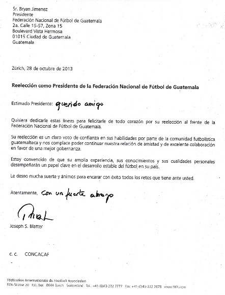 Guatemala, 30 de octubre de 2013. El presidente de la Federación Internacional de Fútbol Asociado (FIFA), Joseph Blatter envió una felicitación al presidente de la Federación Nacional de Fútbol de Guatemala, Dr. Bryan Jiménez, por su reciente reelección y continuidad en el máximo cargo en el fútbol guatemalteco.
