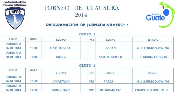 Guatemala, 24 de enero de 2014. El próximo fin de semana se dará por inaugurado el inicio del Torneo de Clausura 2014 del Fútbol Femenino de Guatemala, el juego inicial de la primera jornada se desarrollará el domingo 26 de enero de 2014, entre los equipos de Jalapa vs Santa Isabel II, en juego programado en las instalaciones del Estadio Mario Estrada en Jalapa a las 11:00 hrs.