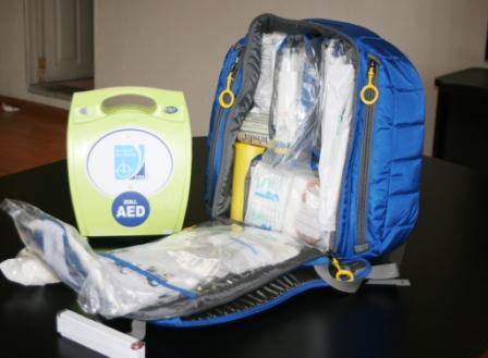 El equipo de emergencia incluye un kit de emergencia médico, con un desfibrilador externo automático con dispositivo portátil capaz de tratar problemas cardíacos de urgencia.