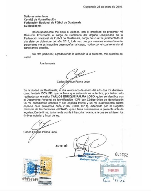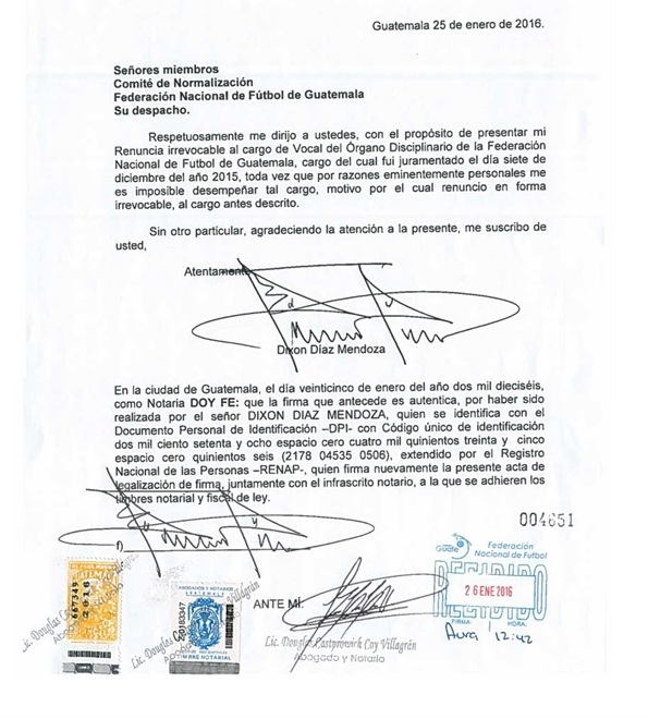 - Que el día de ayer 26 de enero del 2016 a las 12:42 horas los Miembros del Órgano Disciplinario de la Federación Nacional de Fútbol de Guatemala, Licenciados Dixon Díaz Mendoza y Carlos Enrique Palma Lobo, renunciaron a los cargos para los cuales fueron electos por la Asamblea General de la Federación, aduciendo razones personales, no obstante que ya se habían comprometido a asumir sus cargos y los casos pendientes de resolución, tal y como se evidencia en las cartas de renuncia que se anexan al presente comunicado, quedando desintegrado totalmente el Órgano Disciplinario de la Federación por las razones antes indicadas a partir del día de ayer.