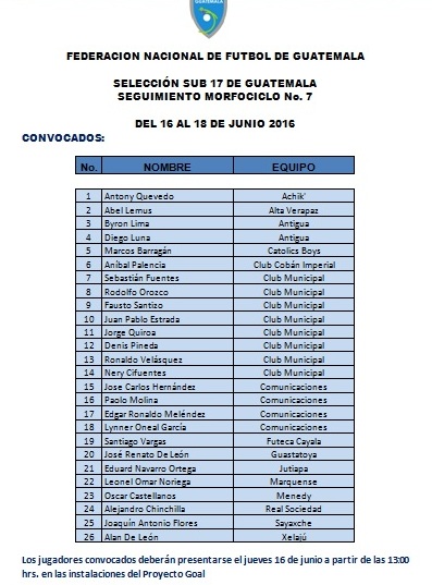 SELECCIÓN SUB 17 - SEGUIMIENTO CONVOCATORIA SEPTIMO MORFOCICLO DEL 16 AL 18 DE JUNIO 2016