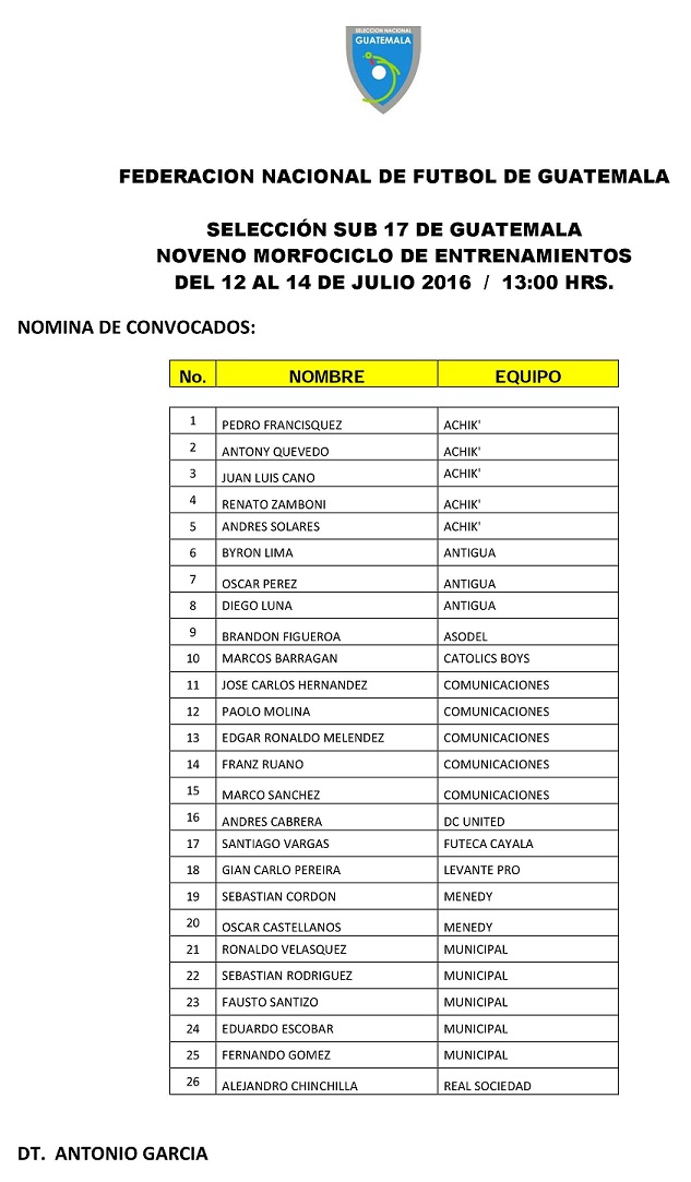 SELECCIÓN SUB 17 CONVOCATORIA NOVENO MORFOCICLO DEL 12 AL 14 DE JULIO 2016