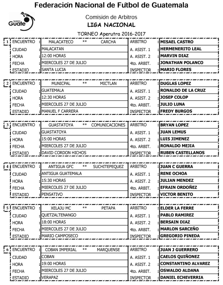 Guatemala, 26 de julio de 2016. La Comisión de Árbitros de la Federación Nacional de Fútbol de Guatemala, ha designado los nombramientos arbitrales correspondientes a la tercera jornada del Torneo de Apertura 2016-2017 de la Liga Nacional programada para el miércoles 27 de julio de 2016.