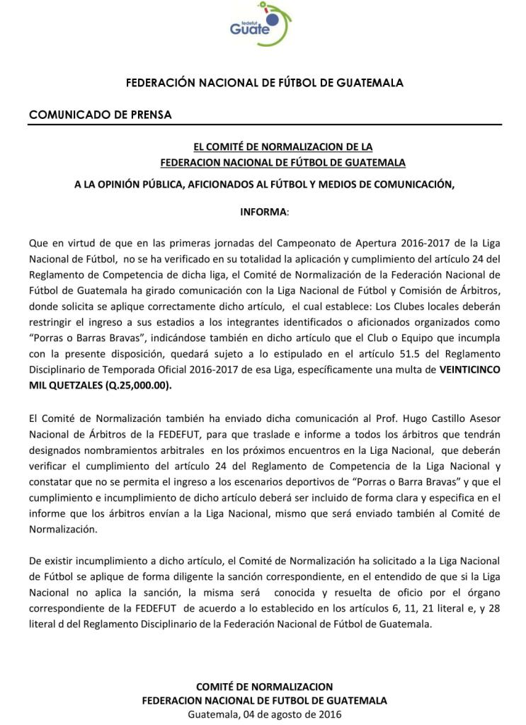 Que en virtud de que en las primeras jornadas del Campeonato de Apertura 2016-2017 de la Liga Nacional de Fútbol, no se ha verificado en su totalidad la aplicación y cumplimiento del artículo 24 del Reglamento de Competencia de dicha liga, el Comité de Normalización de la Federación Nacional de Fútbol de Guatemala ha girado comunicación con la Liga Nacional de Fútbol y Comisión de Árbitros, donde solicita se aplique correctamente dicho artículo, el cual establece: Los Clubes locales deberán restringir el ingreso a sus estadios a los integrantes identificados o aficionados organizados como “Porras o Barras Bravas”, indicándose también en dicho artículo que el Club o Equipo que incumpla con la presente disposición, quedará sujeto a lo estipulado en el artículo 51.5 del Reglamento Disciplinario de Temporada Oficial 2016-2017 de esa Liga, específicamente una multa de VEINTICINCO MIL QUETZALES (Q.25,000.00).