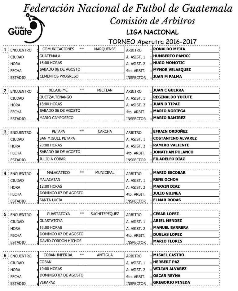 Guatemala, 05 de agosto de 2016. La Comisión de Árbitros de la Federación Nacional de Fútbol de Guatemala, ha designado los nombramientos arbitrales correspondientes a la jornada del 06 y 07 de agosto de 2016.Torneo de Apertura 2016-2017 de la Liga Nacional.