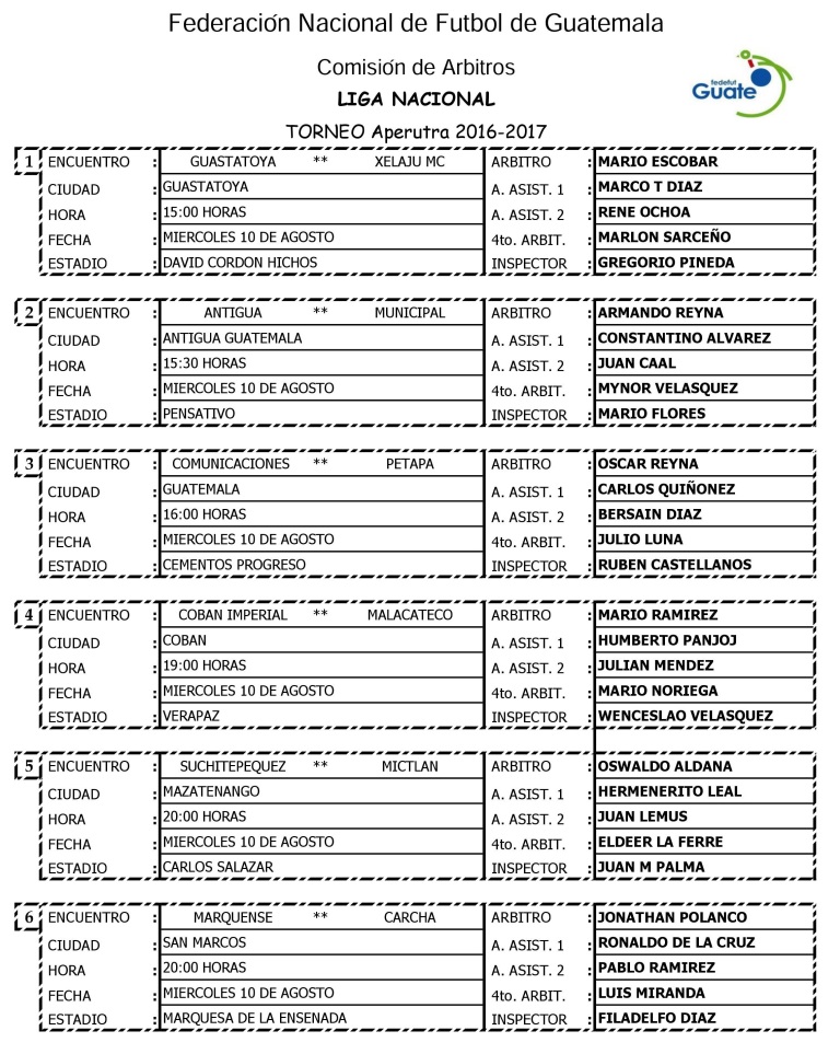 Guatemala, 05 de agosto de 2016. La Comisión de Árbitros de la Federación Nacional de Fútbol de Guatemala, ha designado los nombramientos arbitrales correspondientes a la jornada del 10 de agosto de 2016.Torneo de Apertura 2016-2017 de la Liga Nacional.