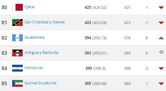 Guatemala, 11 de agosto de 2016. La Selección Nacional de Guatemala, alcanzo 394 puntos en el ranking general que publicó hoy la Federación Internacional de Fútbol Asociado, escalando ocho posición con relación al ranking del mes anterior, el combinado nacional se ubica en puesto 82 del escalafón mundial de la FIFA.