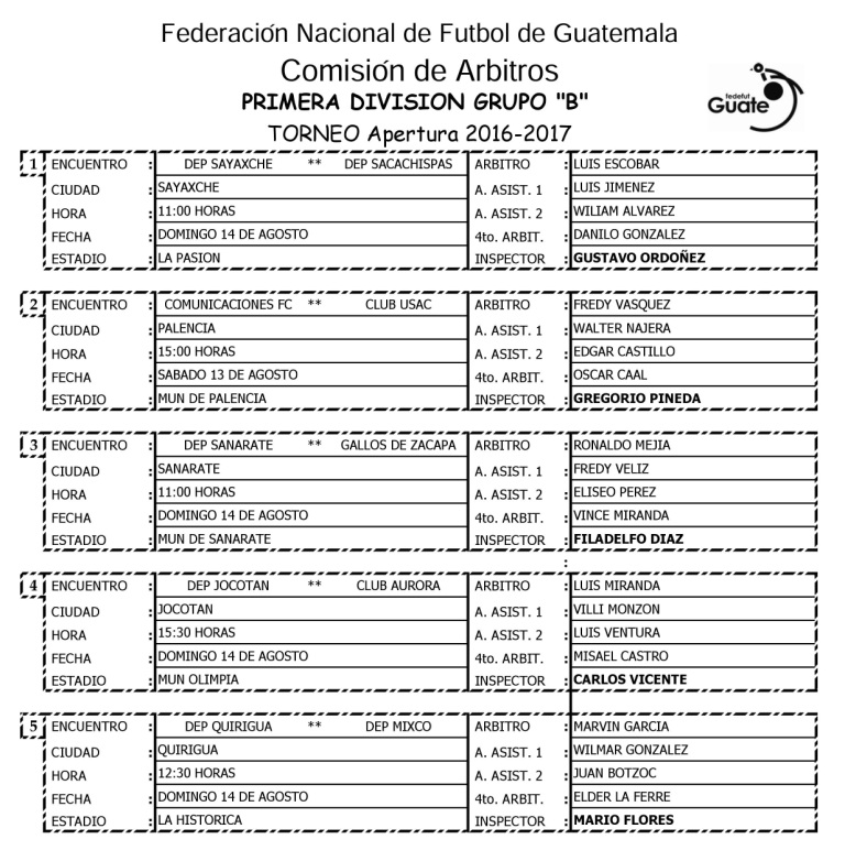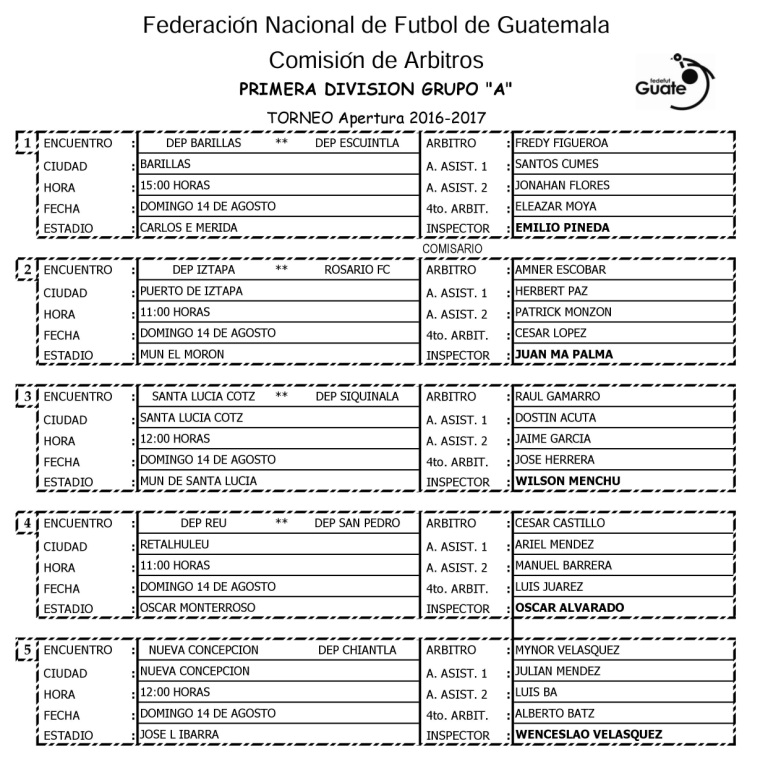PRIMERA DIVISION - NOMBRAMIENTOS ARBITRALES 13 Y 14 DE AGOSTO DE 2016