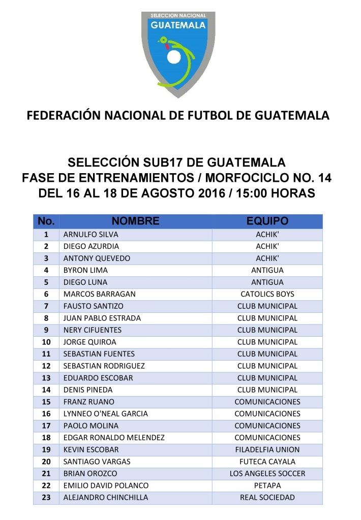 SELECCION SUB 17 / MORFOCICLO DE ENTRENAMIENTOS DEL 16 AL 18 AGOSTO 2016