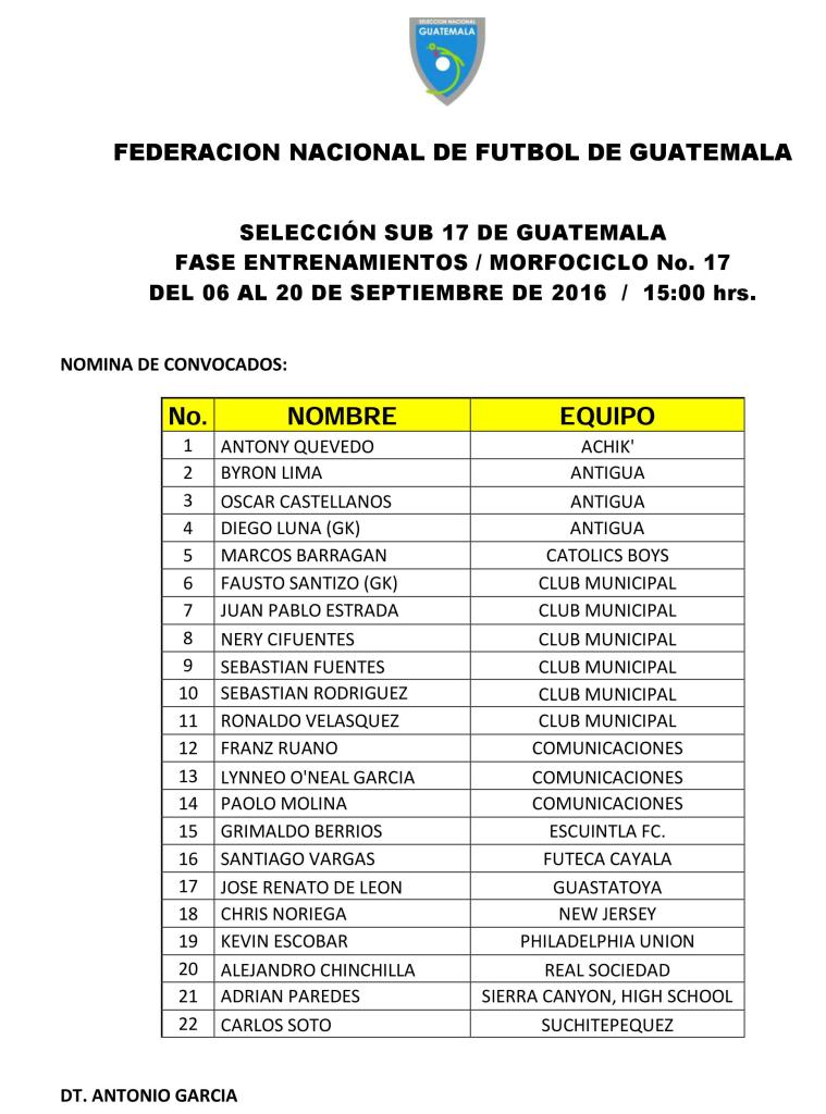 SELECCION SUB 17 / MORFOCICLO DE ENTRENAMIENTOS DEL 06 AL 20 SEPTIEMBRE 2016