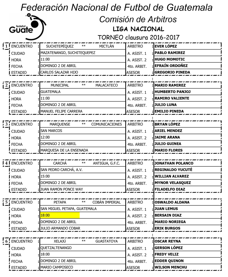 LIGA NACIONAL NOMBRAMIENTOS ARBITRALES JORNADA DEL 02 DE ABRIL 2017