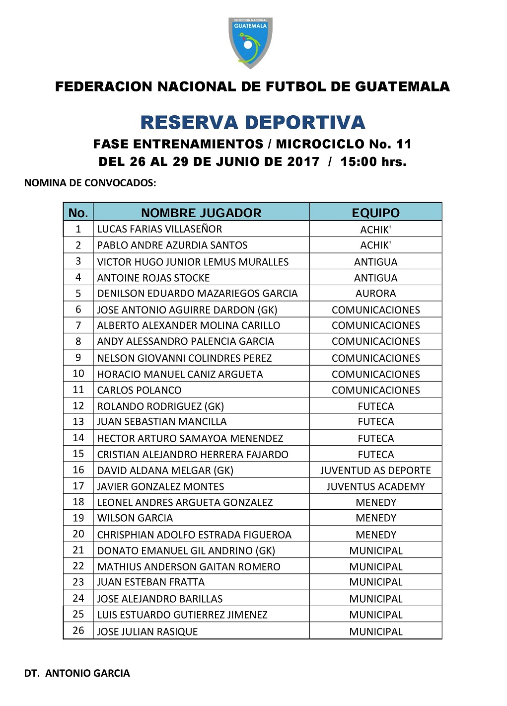 RESERVA DEPORTIVA / MICROCICLO No. 11 DEL 25 AL 29 DE JUNIO 2017