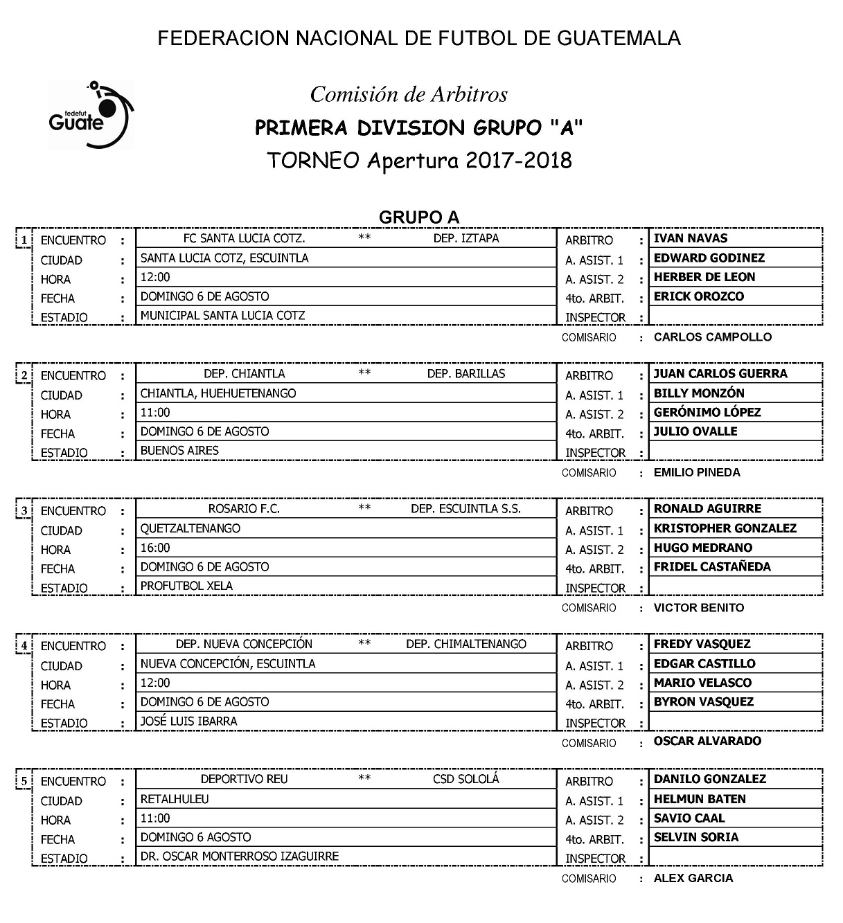 Guatemala, 04 de agosto de 2017. La Comisión de Árbitros de la Federación Nacional de Fútbol de Guatemala, ha designado los nombramientos arbitrales correspondiente a la segunda jornada del Torneo de Apertura 2017-2018 de la Liga Primera División programadas para las fechas del 05 y 06 de agosto de 2017.