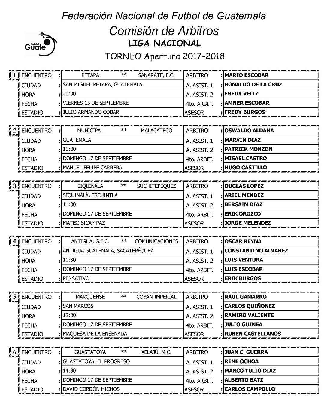Guatemala, 13 de septiembre de 2017. La Comisión de Árbitros de la Federación Nacional de Fútbol de Guatemala, ha designado los nombramientos arbitrales correspondiente a la jornada del 15 y 17 de septiembre del Torneo de Apertura 2017-2018 de la Liga Nacional de Fútbol de la República de Guatemala.