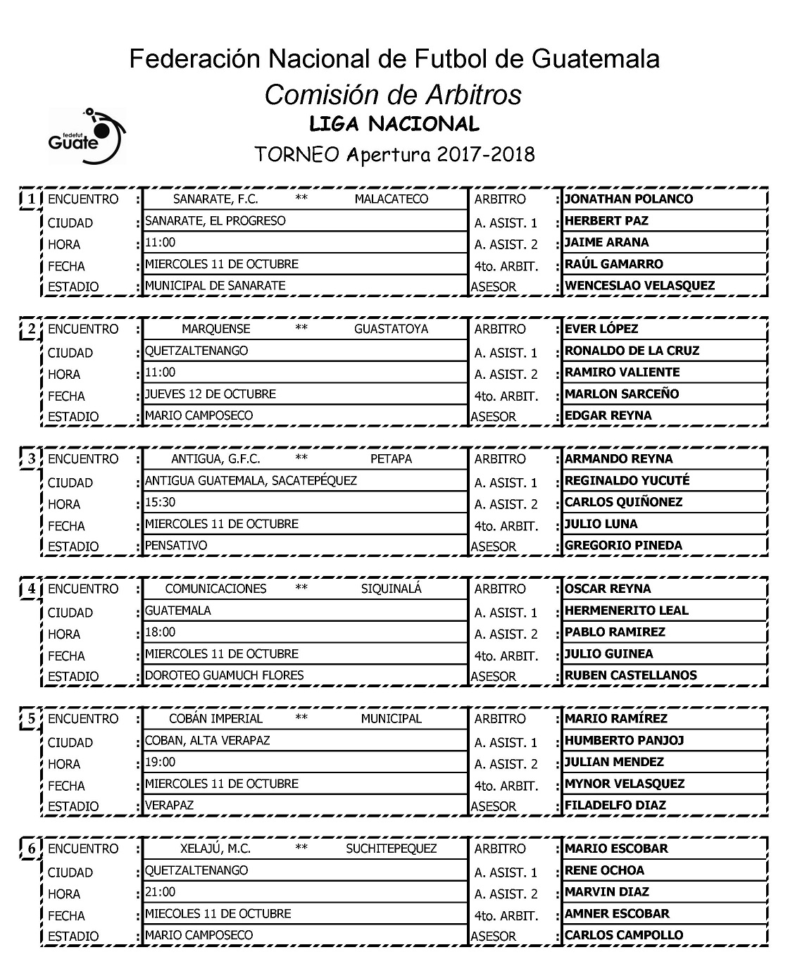 Guatemala, 10 de octubre de 2017. La Comisión de Árbitros de la Federación Nacional de Fútbol de Guatemala, ha designado los nombramientos arbitrales correspondiente a la jornada del 11 y 12 de octubre del Torneo de Apertura 2017-2018 de la Liga Nacional de Fútbol de la República de Guatemala.