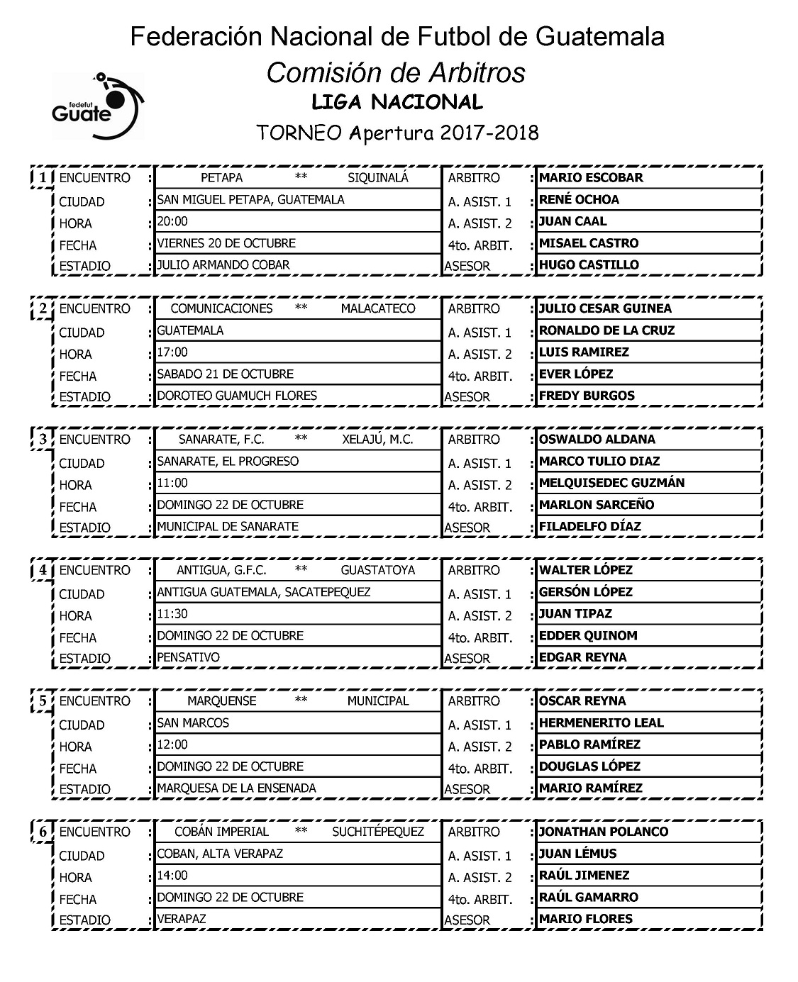 Guatemala, 19 de octubre de 2017. La Comisión de Árbitros de la Federación Nacional de Fútbol de Guatemala, ha designado los nombramientos arbitrales correspondiente a la jornada del 20, 21 y 22 de octubre del Torneo de Apertura 2017-2018 de la Liga Nacional de Fútbol de la República de Guatemala.