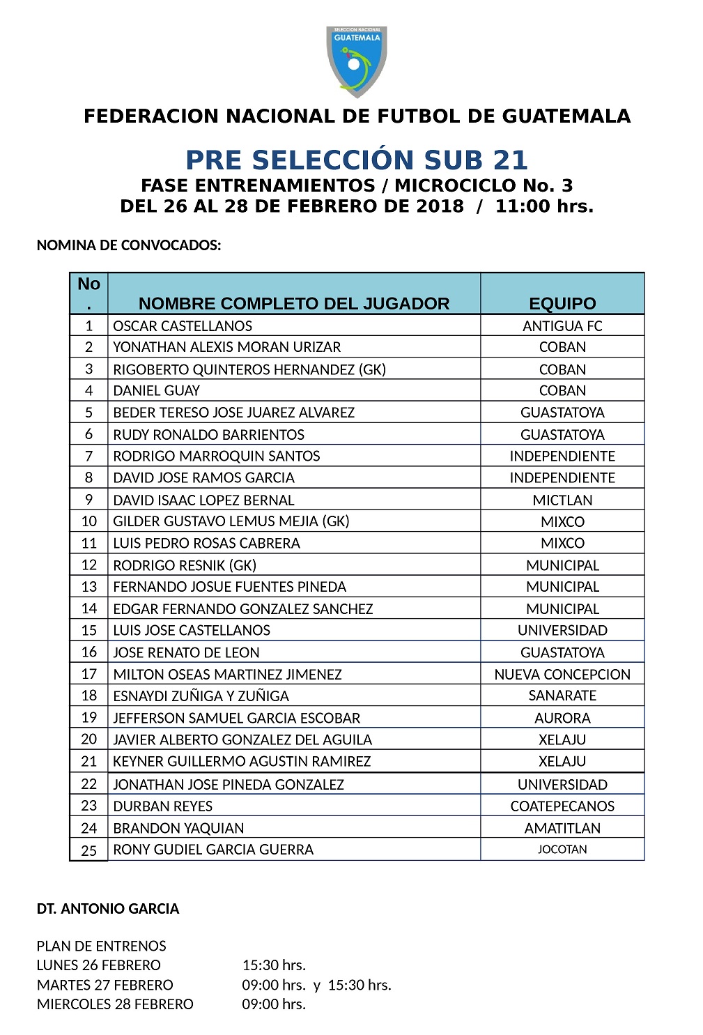 PRE SELECCION SUB 21 / CONVOCATORIA MICROCICLO No. 3 - DEL 26 AL 28 DE FEBRERO 2018