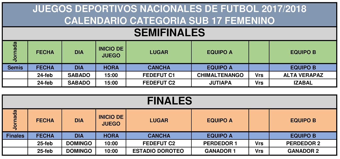 CALENDARIO DE JUEGOS FASE FINAL CATEGORIA SUB 17 FEMENINA / JUEGOS DEPORTIVOS NACIONALES 2018
