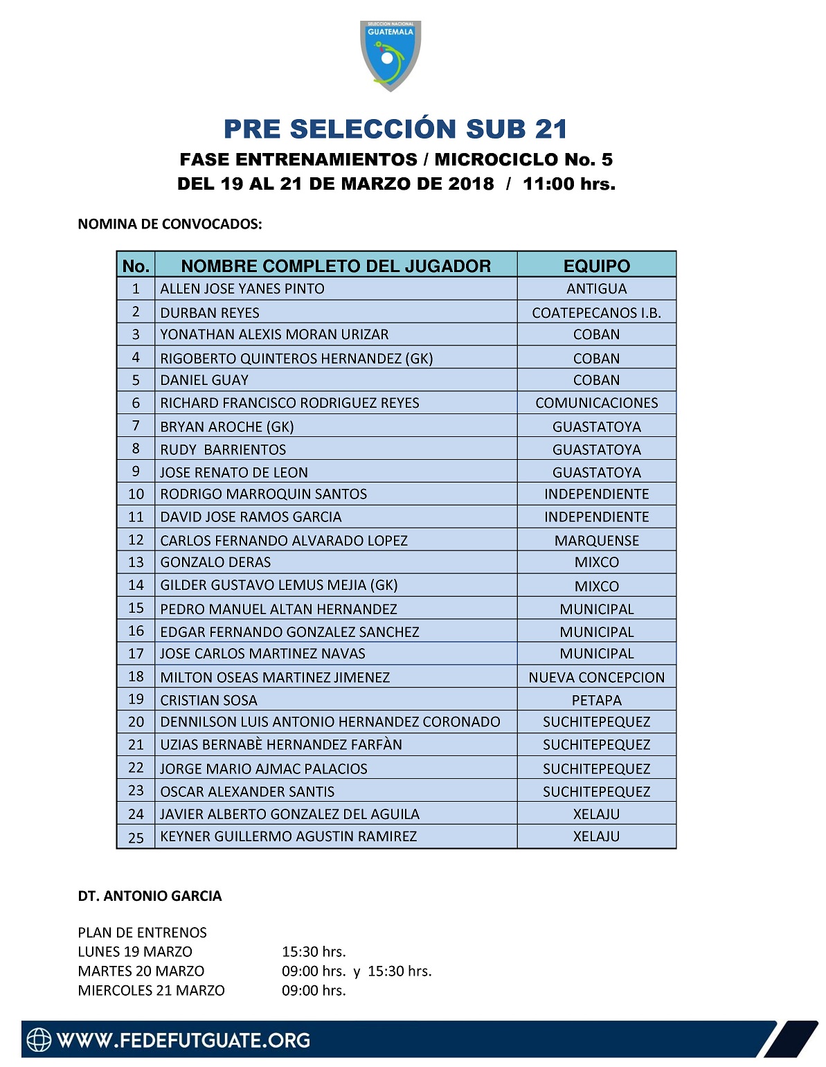 PRE SELECCION SUB 21 / CONVOCATORIA MICROCICLO No. 5 - DEL 19 AL 21 DE MARZO 2018
