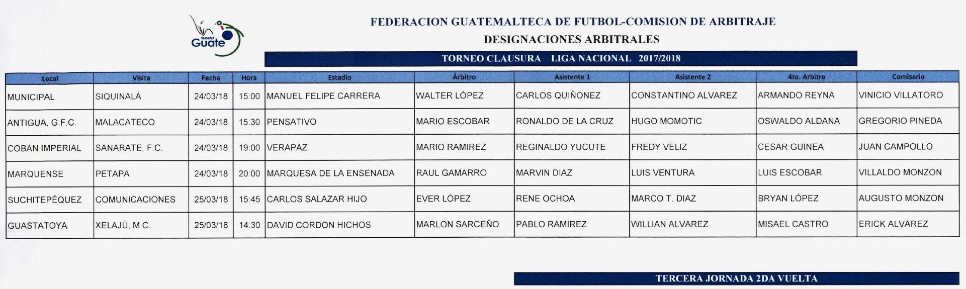 LIGA NACIONAL / NOMBRAMIENTOS ARBITRALES JORNADA DEL 24 AL 25 DE MARZO 2018 / TORNEO CLAUSURA 2018
