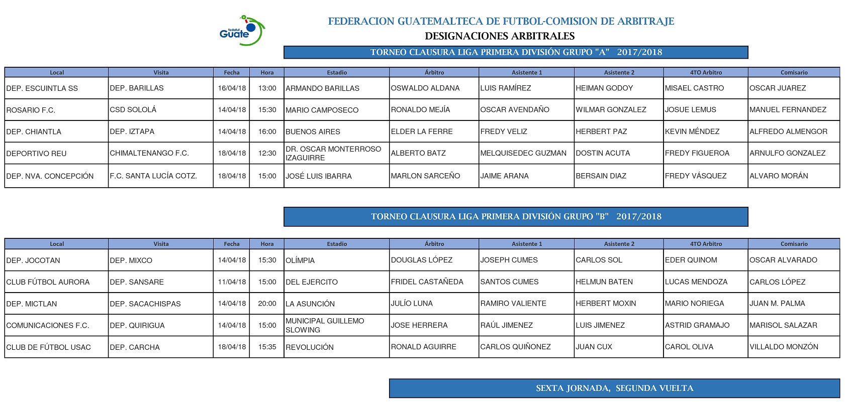 PRIMERA DIVISION / NOMBRAMIENTOS ARBITRALES JORNADA 11, 13, 14 Y 18 DE ABRIL - TORNEO CLAUSURA 2018