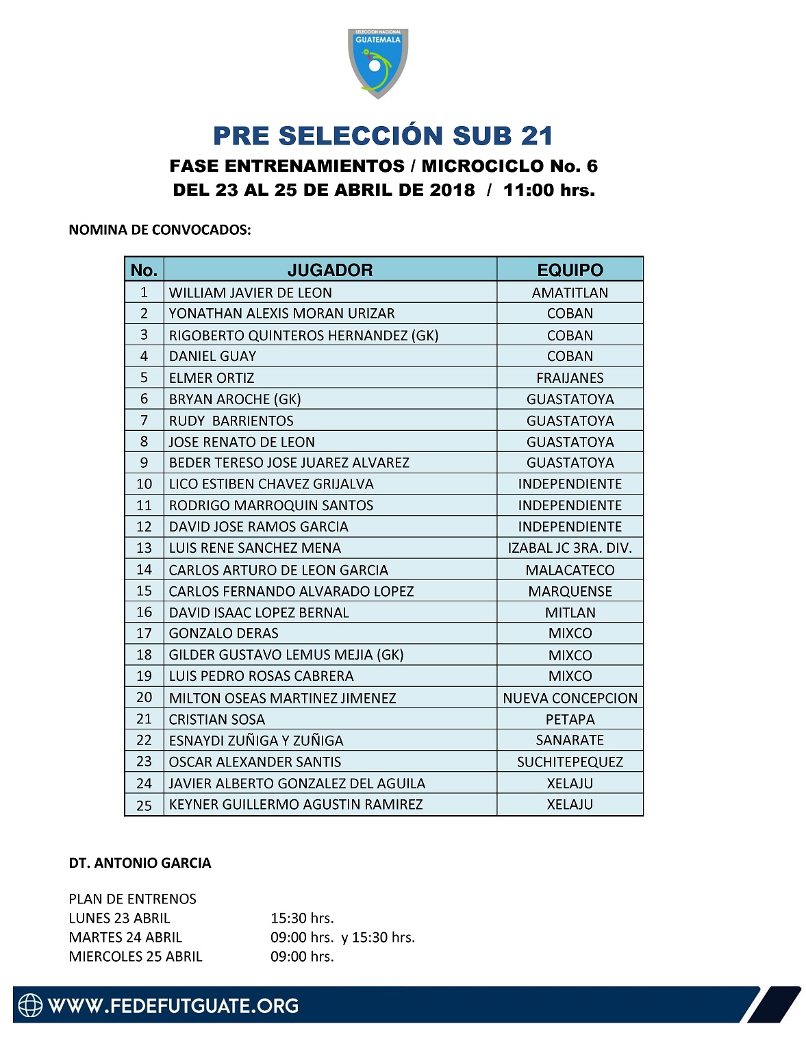 PRE SELECCION SUB 21 / CONVOCATORIA MICROCICLO No. 6 - DEL 23 AL 25 DE ABRIL 2018