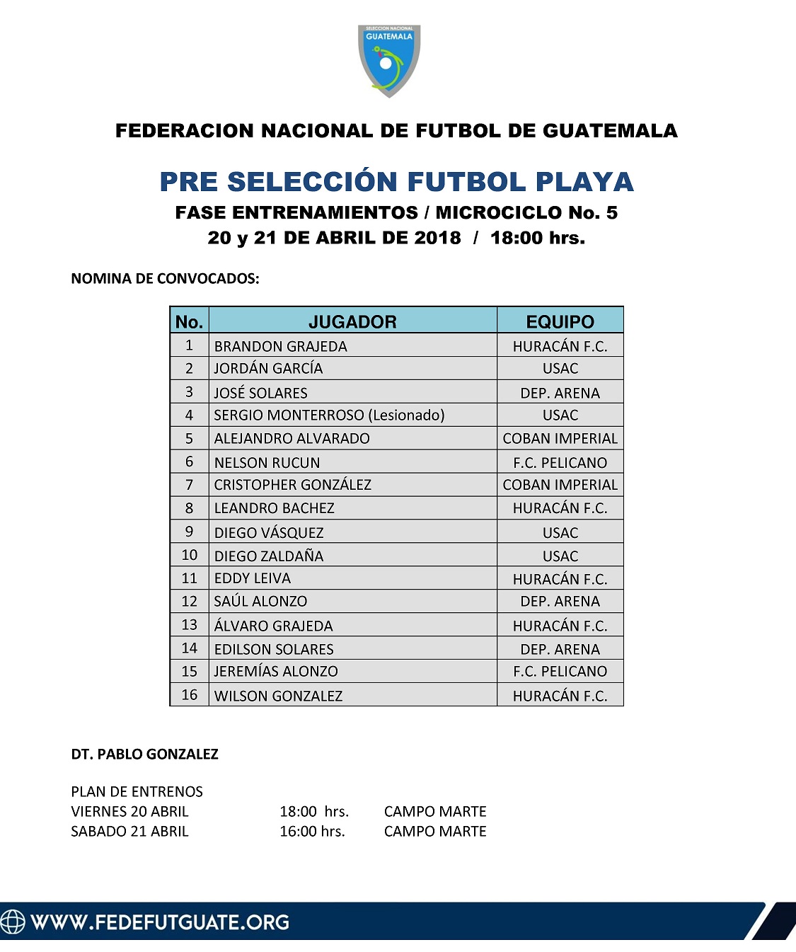 PRE SELECCION FUTBOL PLAYA / MICROCICLO ENTRENAMIENTOS No. 5 / 20 y 21 ABRIL 2018