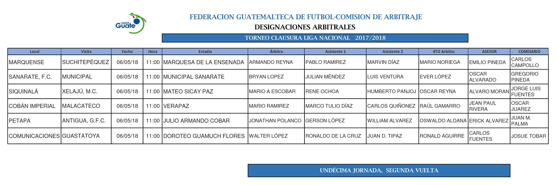 LIGA NACIONAL / NOMBRAMIENTOS ARBITRALES JORNADA 6 DE MAYO - TORNEO CLAUSURA 2018