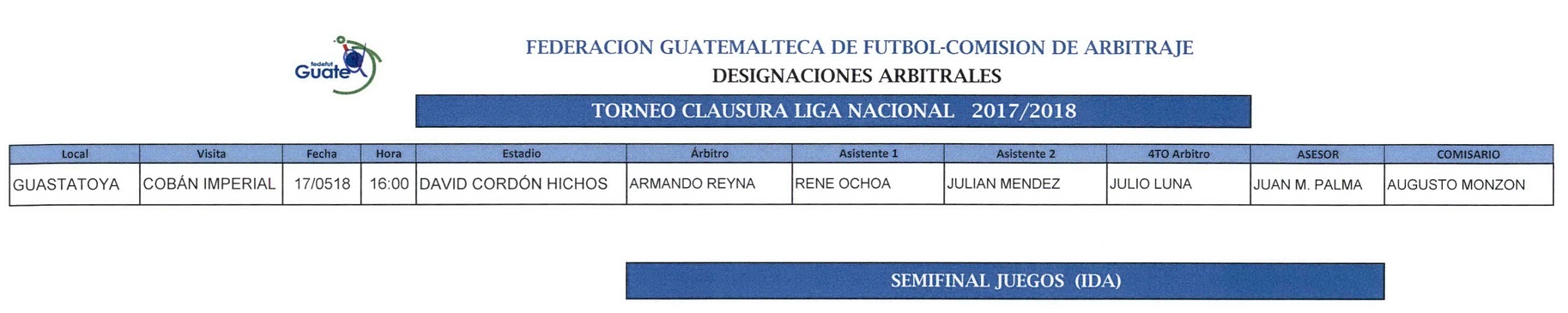 LIGA NACIONAL / NOMBRAMIENTO ARBITRAL / GUASTATOYA vs. COBAN IMPERIAL - SEMIFINAL IDA - TORNEO CLAUSURA 2018