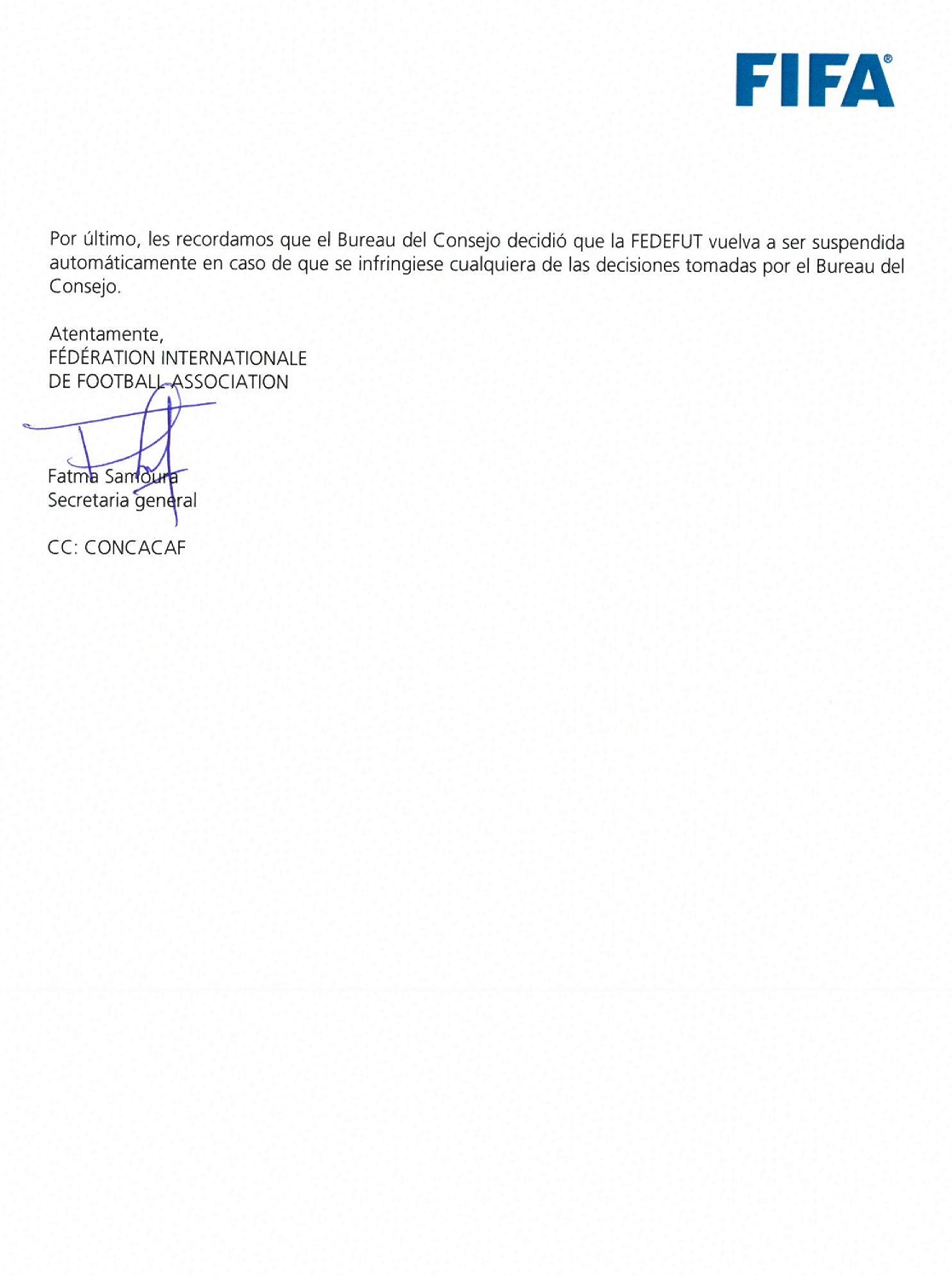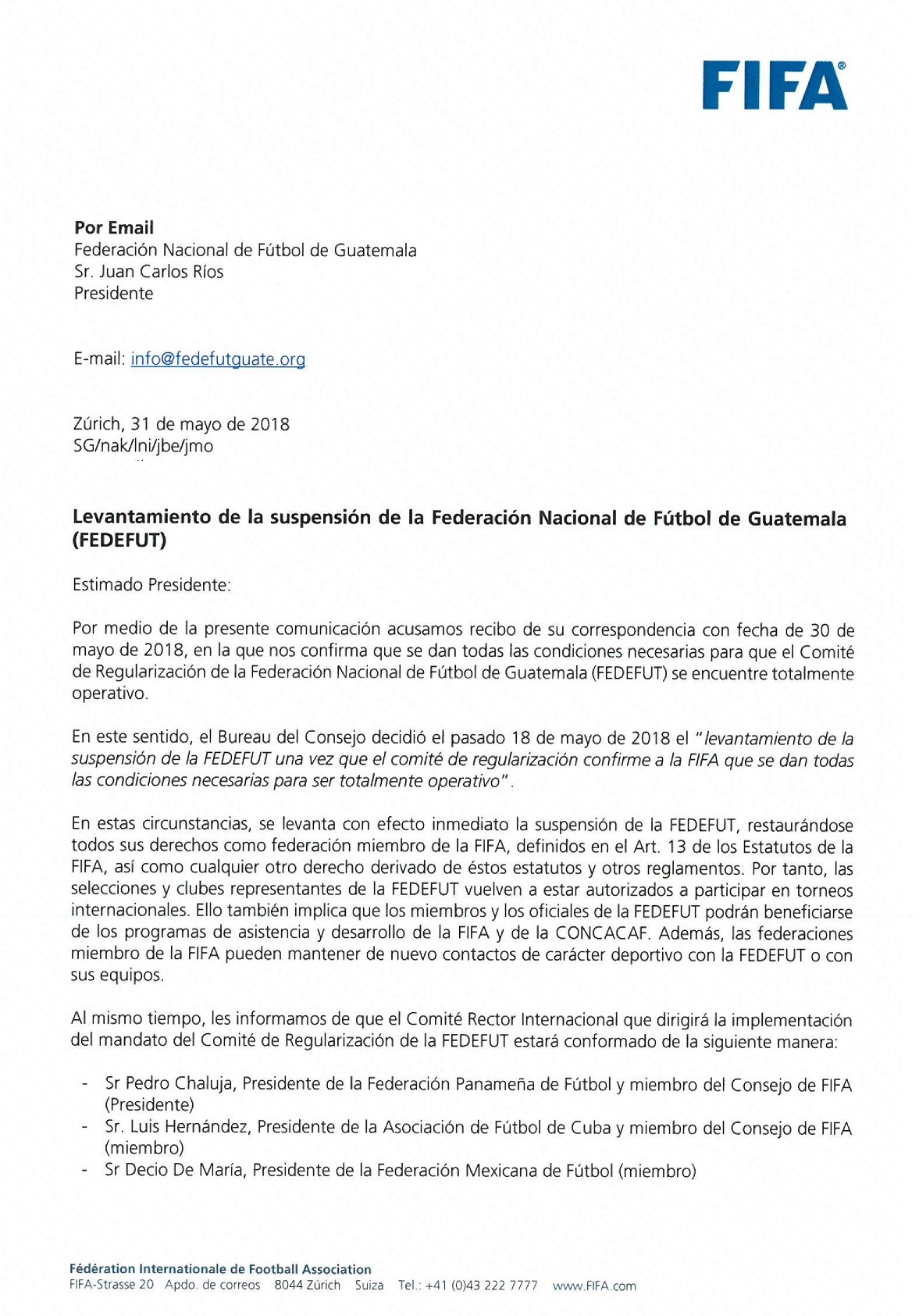 COMUNICACION OFICIAL DE FIFA SOBRE EL LEVANTAMIENTO DE LA SUSPENSION DE LA FEDEFUT