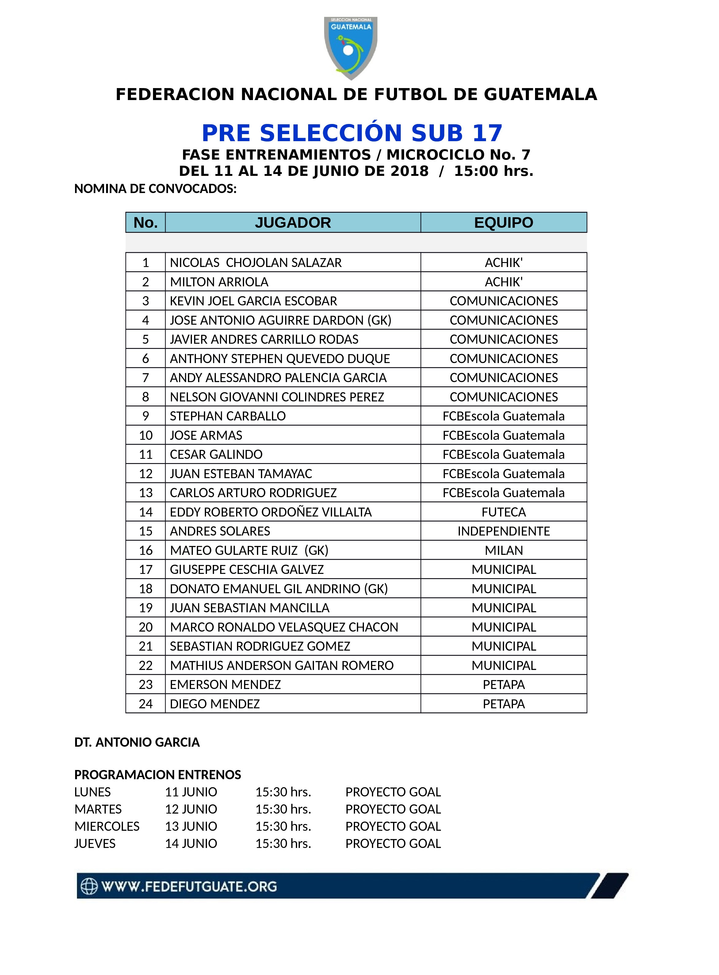 PRELECCION SUB 17 / CONVOCATORIA MICROCICLO NO. 7 DEL 11 AL 14 DE JUNIO 2018