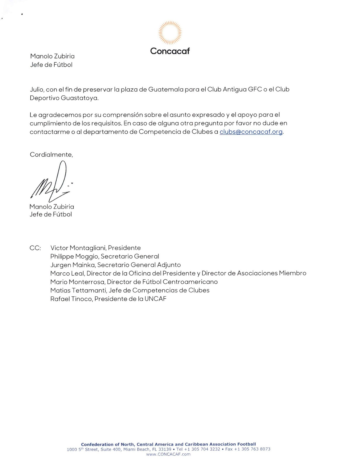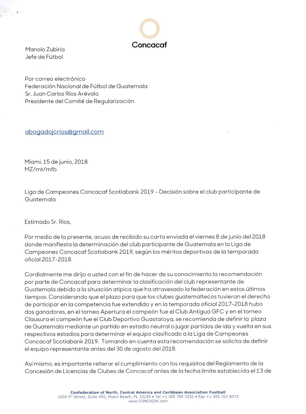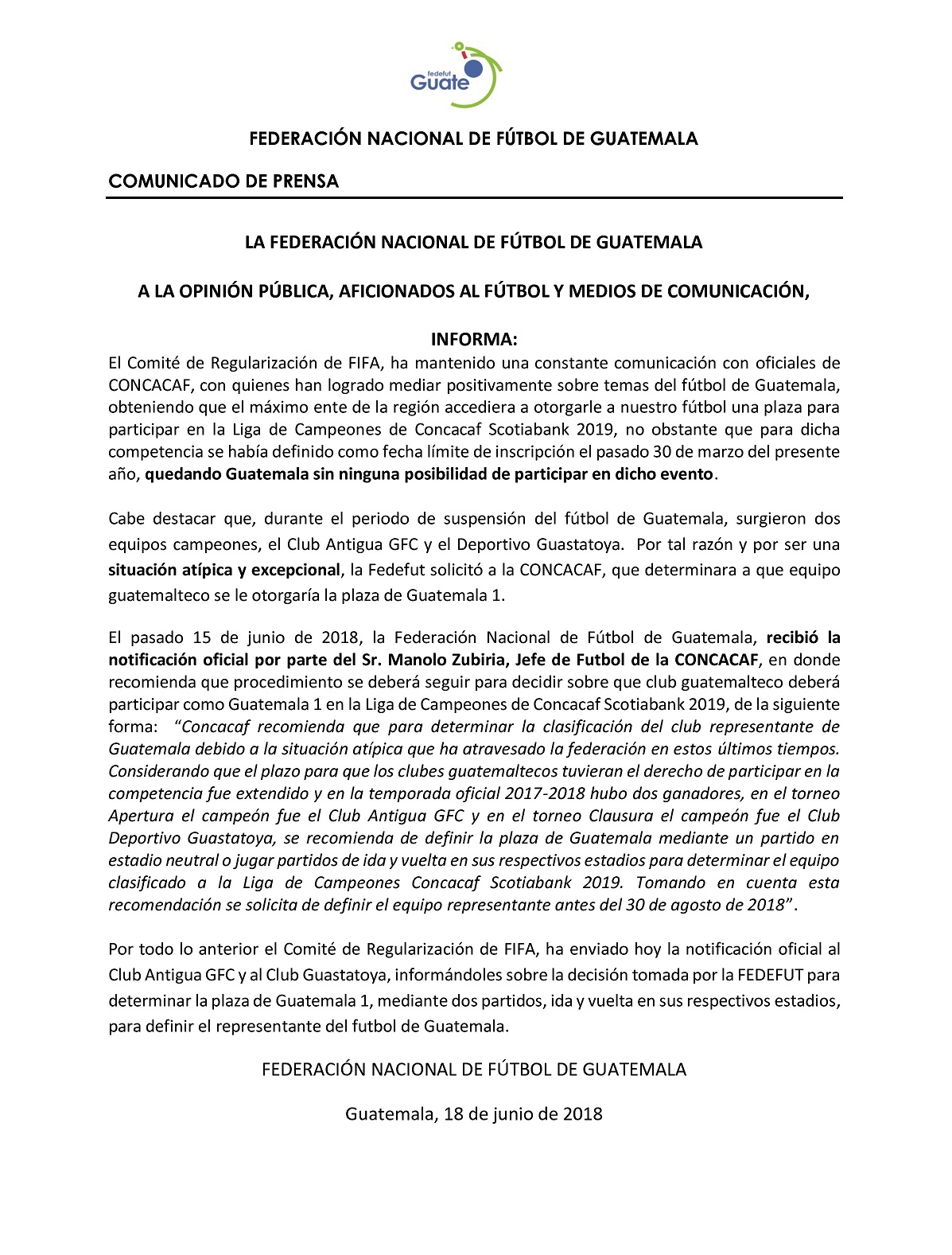 COMUNICADO DE PRENSA / DECISION FEDEFUT SOBRE GUATEMALA 1 / LIGA DE CAMPEONES CONCACAF SCOTIABANK 2019