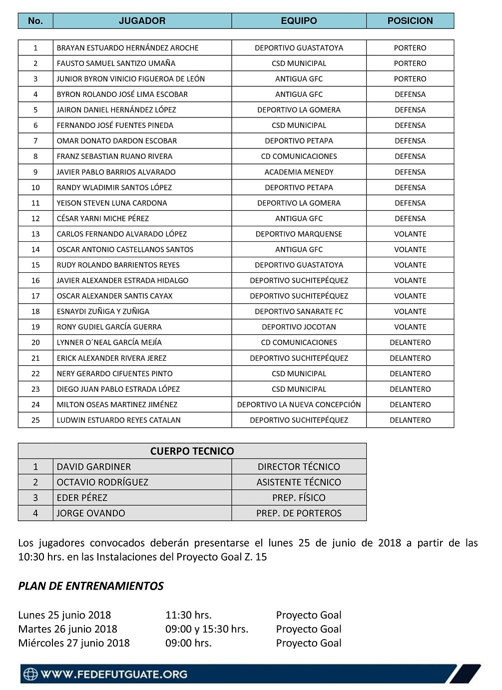 Guatemala, 21 de junio de 2018. Bajo la Dirección Técnica del Prof. David Gardiner, la Selección Sub 20 de Guatemala, dará inicio la próxima semana a un nuevo proceso de preparación y entrenamientos con miras a futuras competencias internacionales.