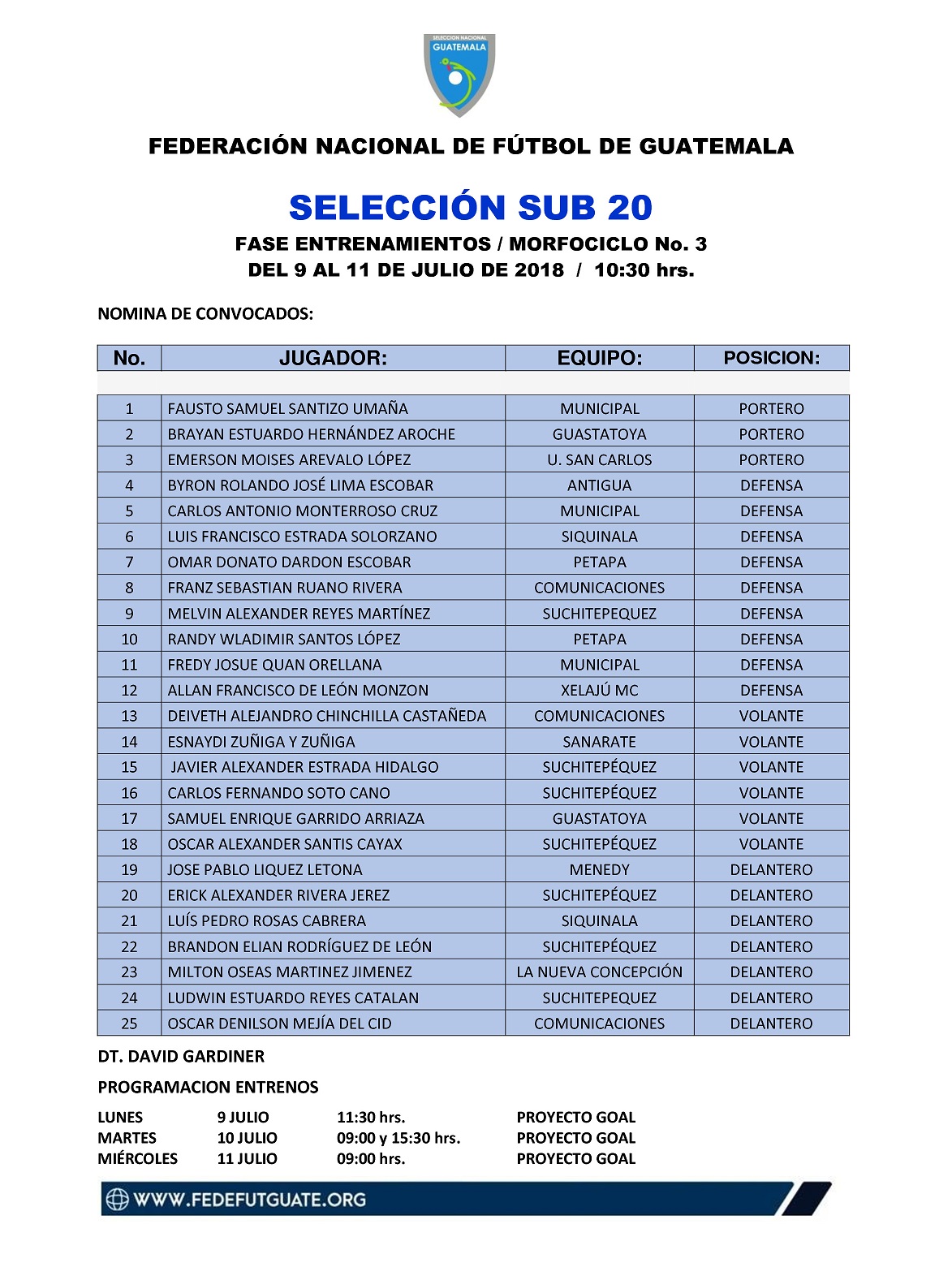 SELECCION SUB 20 / CONVOCATORIA MORFOCICLO No. 3 / DEL 9 AL 11 DE JULIO 2018