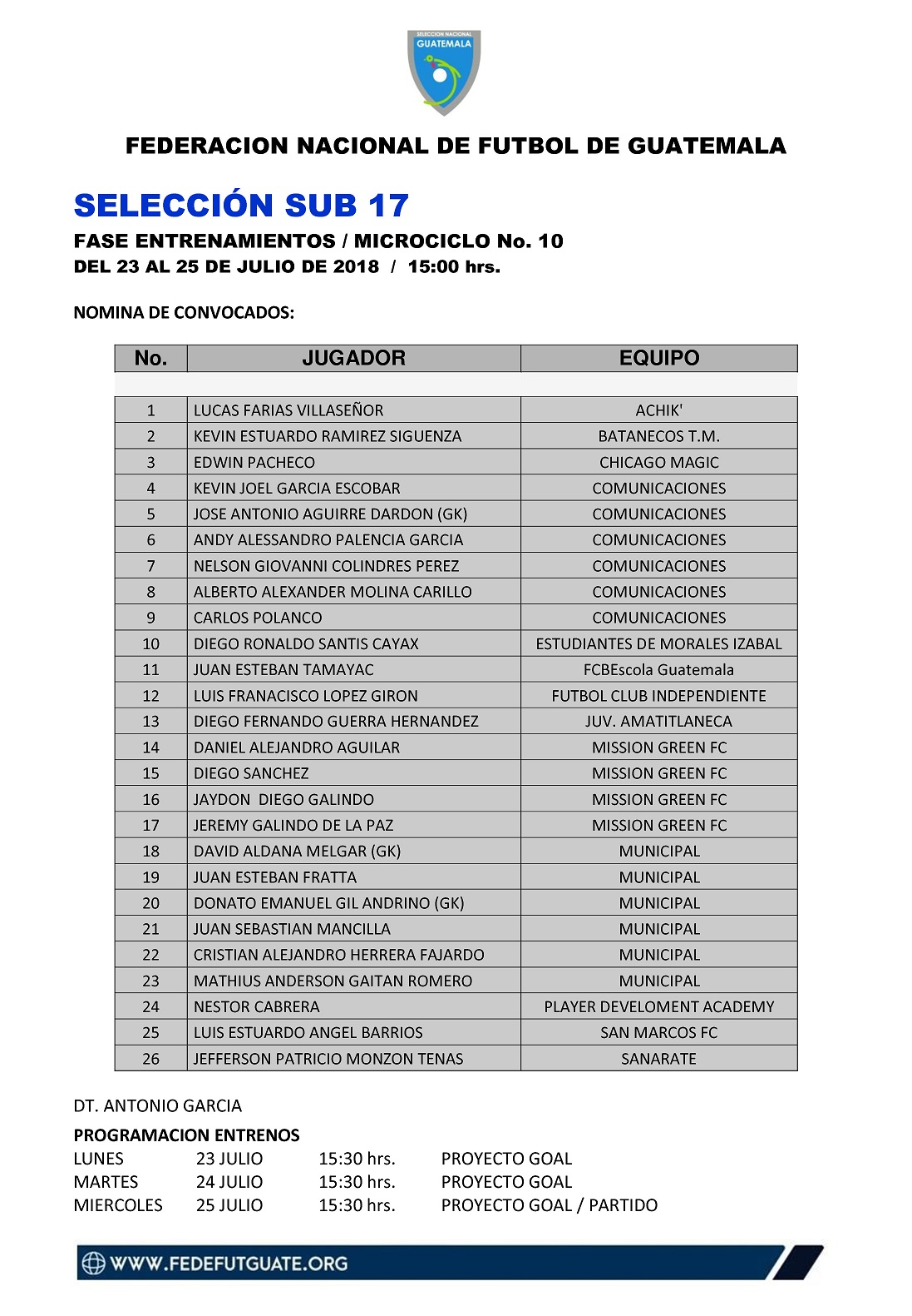 Guatemala, 20 de julio 2018. El Director Técnico de Selección Nacional Sub 17 de Guatemala, profesor Antonio García, ha dado a conocer la nómina de convocados para el decimo microciclo de entrenamientos, programado para las fechas del 23 al 25 de julio de 2018.
