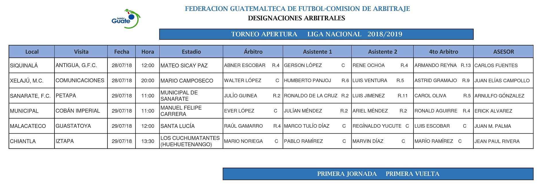 Guatemala, 27 de julio de 2018. La Comisión de Árbitros de la Federación Nacional de Fútbol de Guatemala, ha designado los nombramientos arbitrales correspondiente a la primera jornada del Torneo Apertura 2018-2019 de la LIga Nacional de Fútbol.