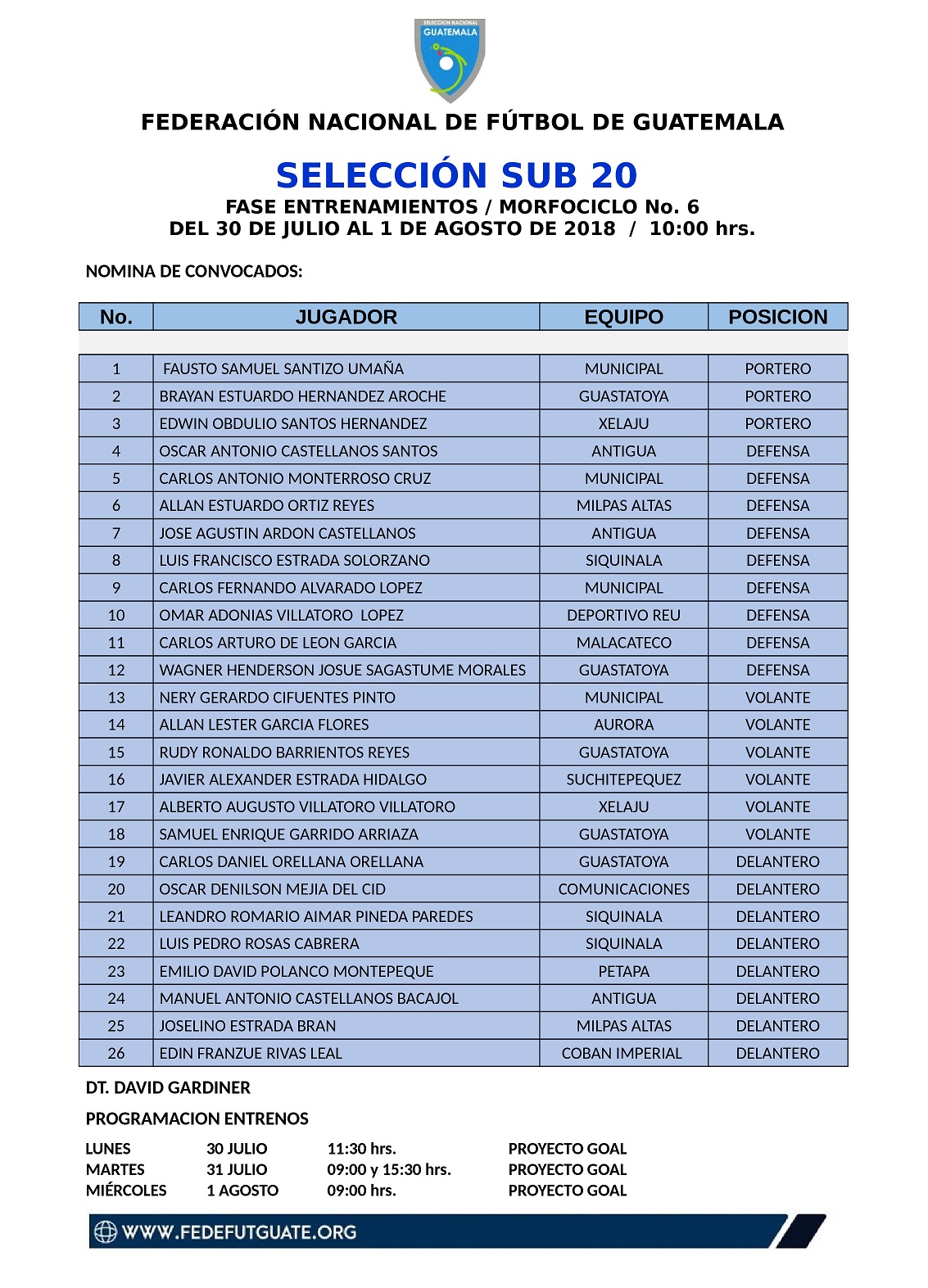 SELECCION SUB 20 / CONVOCATORIA MORFOCICLO No. 6 / DEL 30 JULIO AL 1 DE AGOSTO 2018