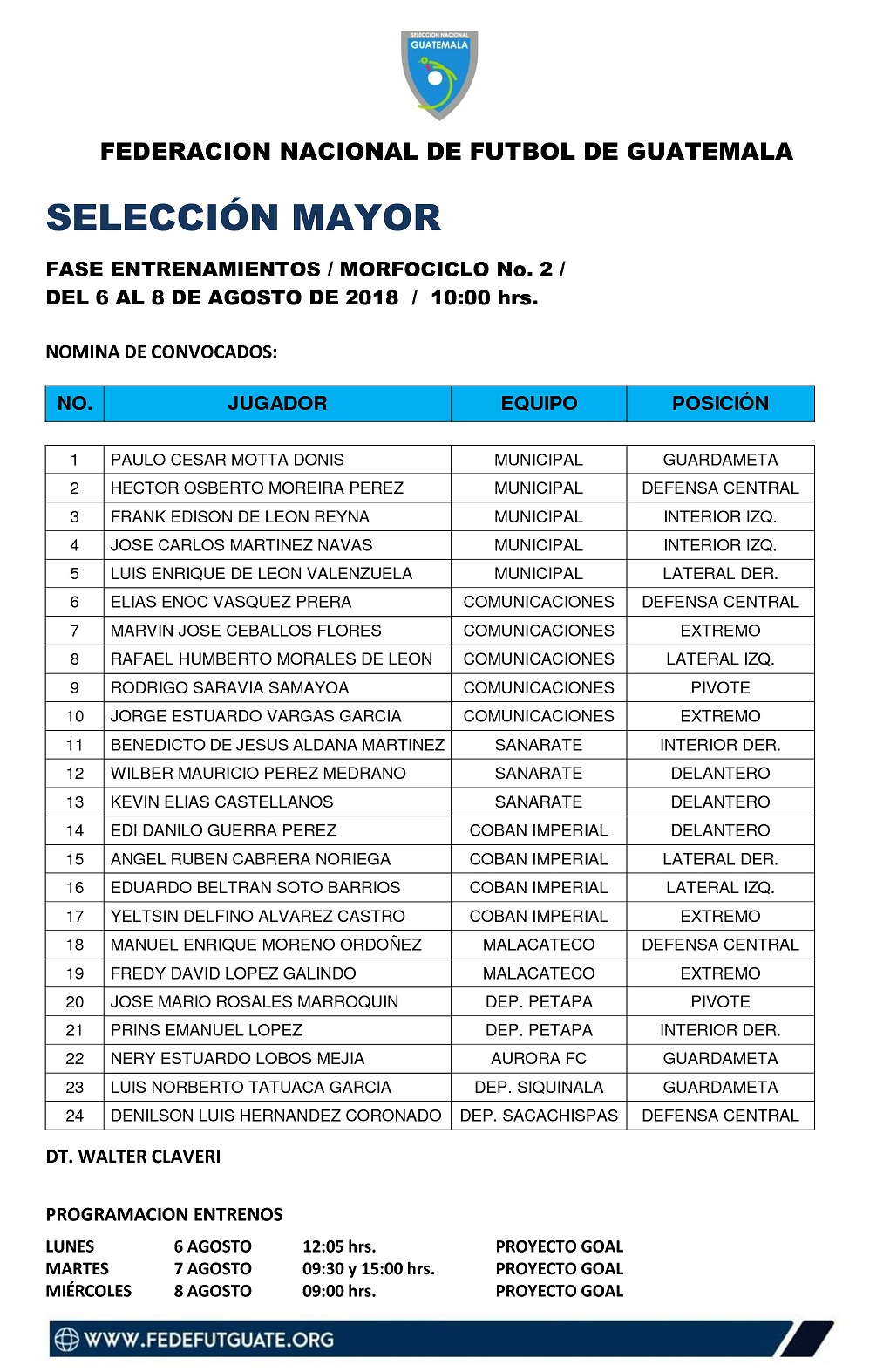 Guatemala, 3 de agosto 2018. El Director Técnico de Selección Nacional Mayor de Guatemala, profesor Walter Claverí, ha dado a conocer la nómina de convocados para el segundo morfociclo de entrenamientos, programado para las fechas del 6 al 8 de agosto de 2018.