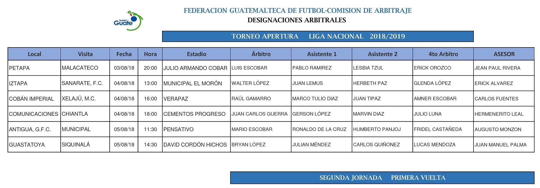 Guatemala, 3 de agosto de 2018. La Comisión de Árbitros de la Federación Nacional de Fútbol de Guatemala, ha designado los nombramientos arbitrales correspondiente a la segunda jornada del Torneo Apertura 2018-2019 de la LIga Nacional de Fútbol.