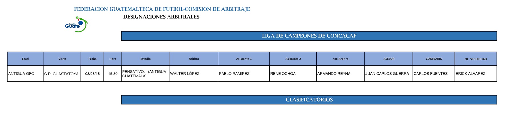 ANTIGUA GFC vs. CD GUASTATOYA / NOMBRAMIENTO ARBITRAL / JUEGO DE IDA / SERIE GUATEMALA 1