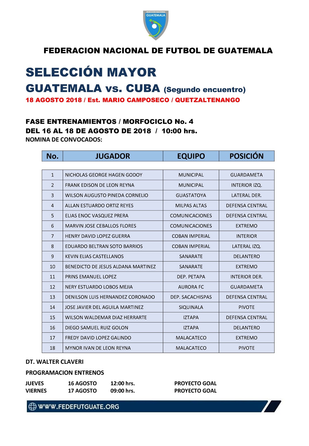 Guatemala, 13 de agosto 2018. El Director Técnico de Selección Nacional Mayor de Guatemala, profesor Walter Claverí, ha dado a conocer la nómina oficial de convocados para el cuarto morfociclo de entrenamientos, programado para las fechas del 16 al 18 de agosto de 2018.