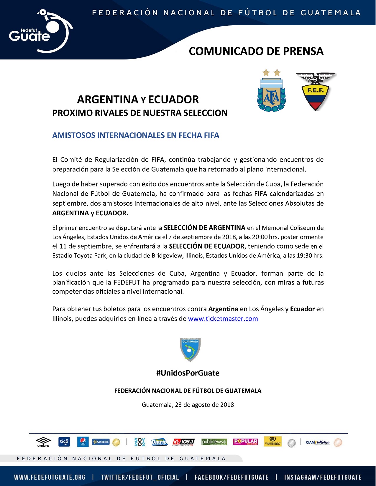 COMUNICADO DE PRENSA / ARGENTINA Y ECUADOR PROXIMOS RIVALES DE NUESTRA SELECCION