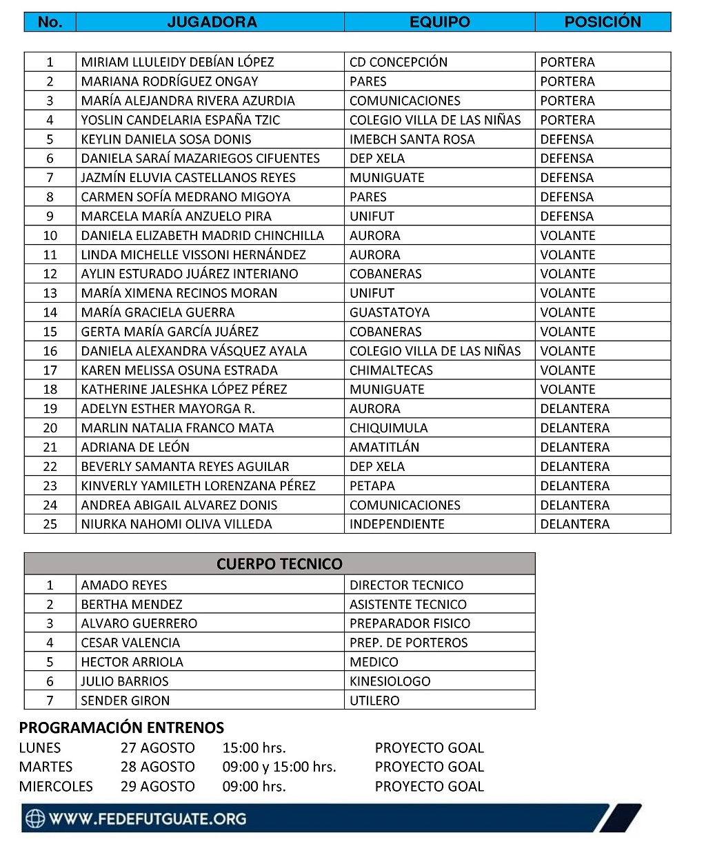 La primera convocatoria de la Selección Femenil está programada para el lunes 27 al miércoles 29 de agosto y fue girada a 25 jugadoras integrantes de los equipos de la Liga de Fútbol Femenino de Guatemala, entre otros clubes.