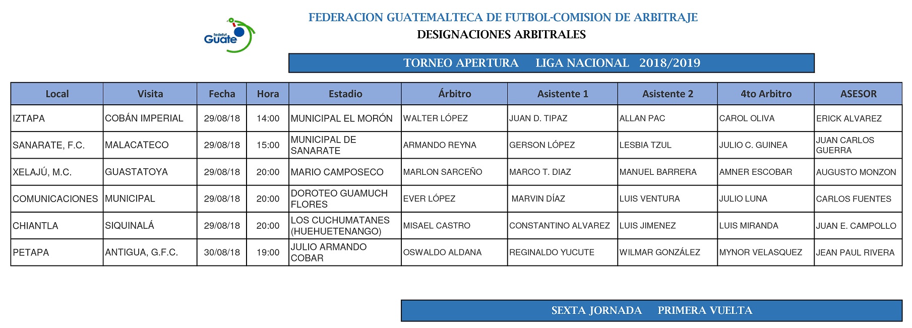 LIGA NACIONAL / NOMBRAMIENTOS ARBITRALES / SEXTA JORNADA DEL TORNEO APERTURA 2018/2019