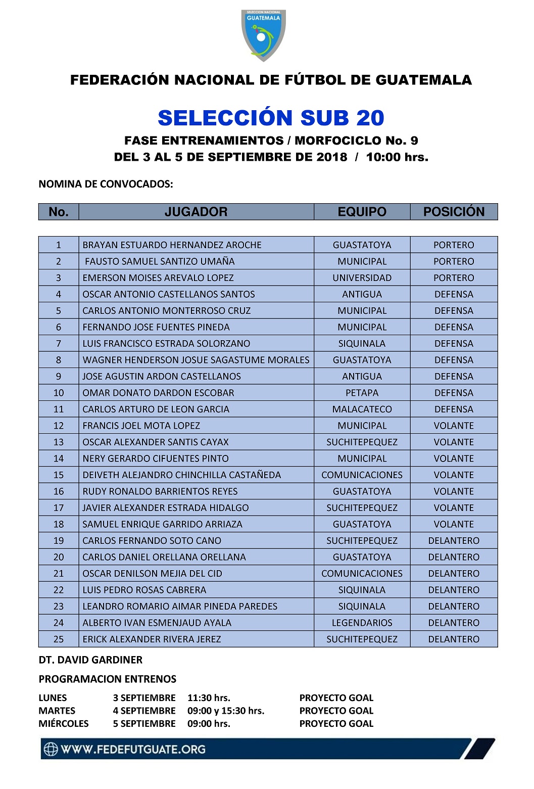 SELECCION SUB 20 / CONVOCATORIA MORFOCICLO No. 9 / DEL 3 AL 5 DE SEPTIEMBRE 2018