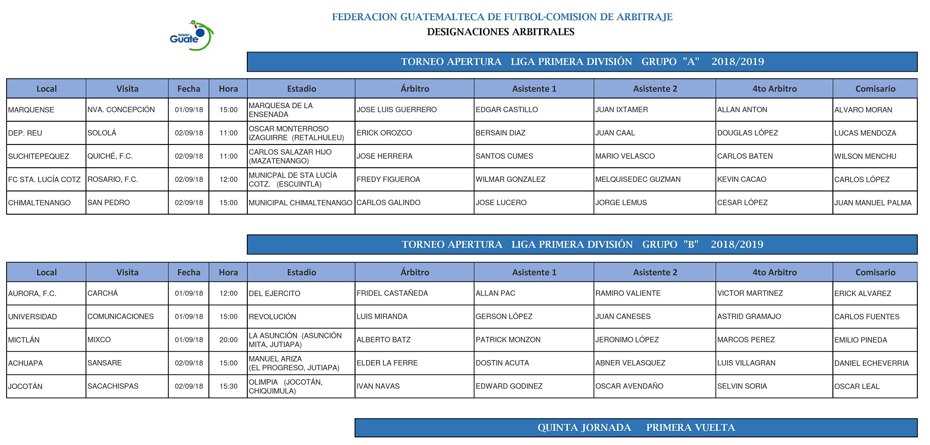 PRIMERA DIVISION / NOMBRAMIENTOS ARBITRALES QUINTA JORNADA TORNEO APERTURA 2018-2019