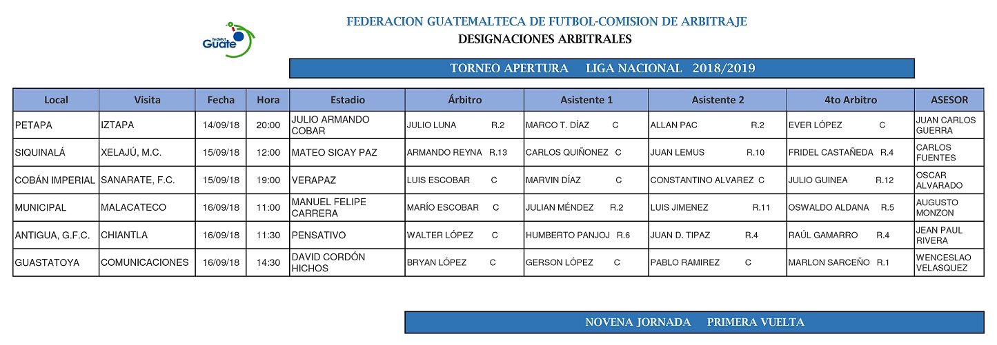 LIGA NACIONAL / NOMBRAMIENTOS ARBITRALES / NOVENA JORNADA DEL TORNEO APERTURA 2018/2019